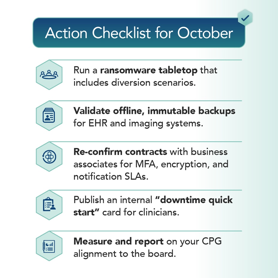 This Cybersecurity Awareness Month, let’s commit to learning from these incidents, strengthening our programs, and defending differently so that care delivery remains uninterrupted.  The time to act is now; stop waiting for mandates or regulations while leaving your organization exposed to known risks and vulnerabilities.
