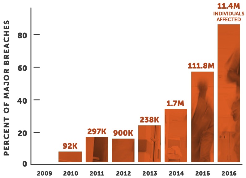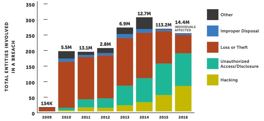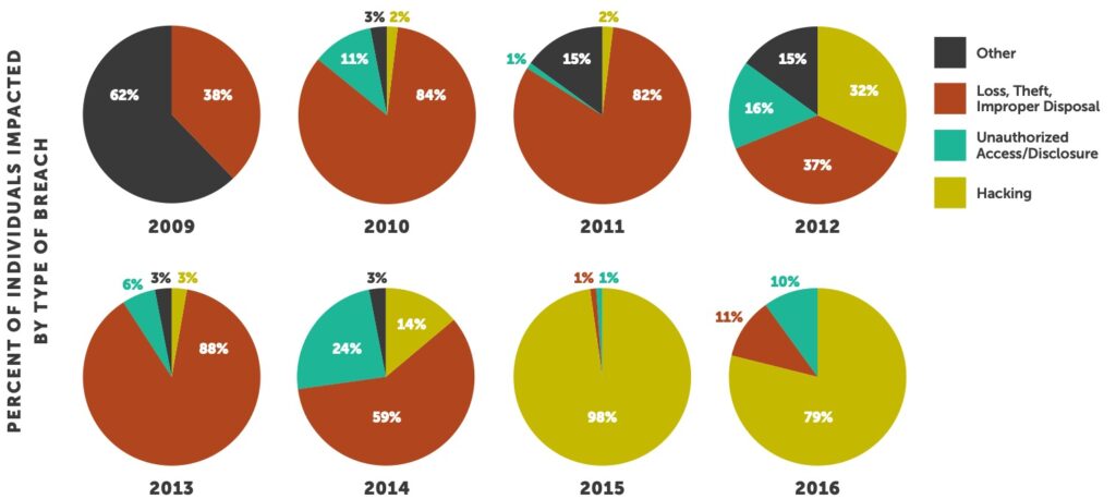 Healthcare has been targeted and breached more in the last two years than it is has since OCR began reporting data in 2009. This is alarming because our industry has been slow to implement industry-leading security technologies and effectively engage staff as well as senior management. We are now seeing the fallout of years of neglect — but there is light at the end of the tunnel. Historically, the majority of breaches were the result of inadvertent user error, whereas today we see the opposite. Loss, Theft or Improper Disposal represents 11% of all impacted individuals in 2016, down from an all-time high of 84% in 2010.