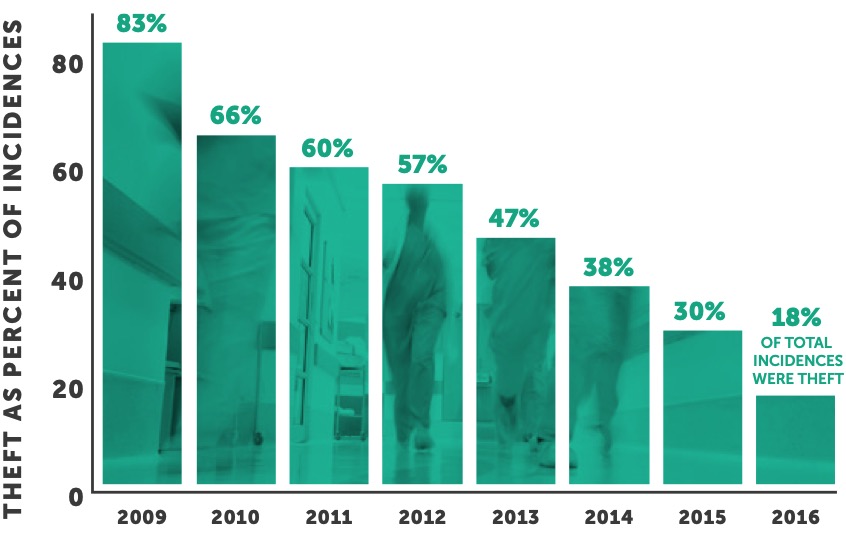 On a positive note, the implementation of cybersecurity educational programs over the past few years by healthcare organizations has increased awareness and led to the reduction in the number of breaches caused by theft. For the third year in a row, the number of entities compromised due to theft has decreased. This year, only 18% of major breaches were caused by theft — down from an all-time high of 83% in 2009.