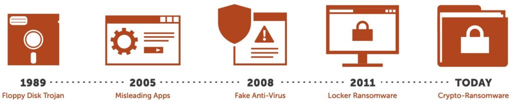 There was a pretty significant lull in activity until 2005 when a new type of ransomware was utilized: Misleading Apps. This malware exaggerated the impact of issues on the computer and required payment to “fix” the issues within the infected system. The evolution continued in 2008 when “Fake Anti-Virus” software was introduced; it would run fake scans claiming to find large numbers of threats and security issues on the computer. In 2011, we began to see “Locker” ransomware which would disable access and control of the computer, effectively locking up the computer from use. Today, we are seeing what most people recognize as ransomware: Crypto-ransomware. This is what we’ve seen in the news when the malware encrypts local and network file shares and databases.