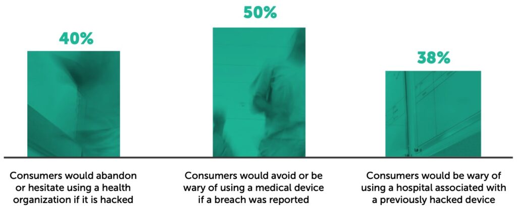 These breaches are coming at a time when patients are starting to act more like consumers. This forces healthcare organizations to guard their reputations, develop strategies for better patient engagement, and provide increased amounts of sensitive data to multiple interconnected devices. Recognizing the potential impacts of a breach on an organization before one occurs is important as many health systems only start investing in cybersecurity after they have been negatively impacted by an incident and, at that point, it may be too late for some patients. Reports* suggest that nearly forty- percent of consumers would abandon or hesitate using a health organization if it is hacked. Fifty- percent of consumers would avoid or be wary of using a medical device if a breach was reported and thrity-eight percent would be wary of using a hospital associated with a previously hacked device.