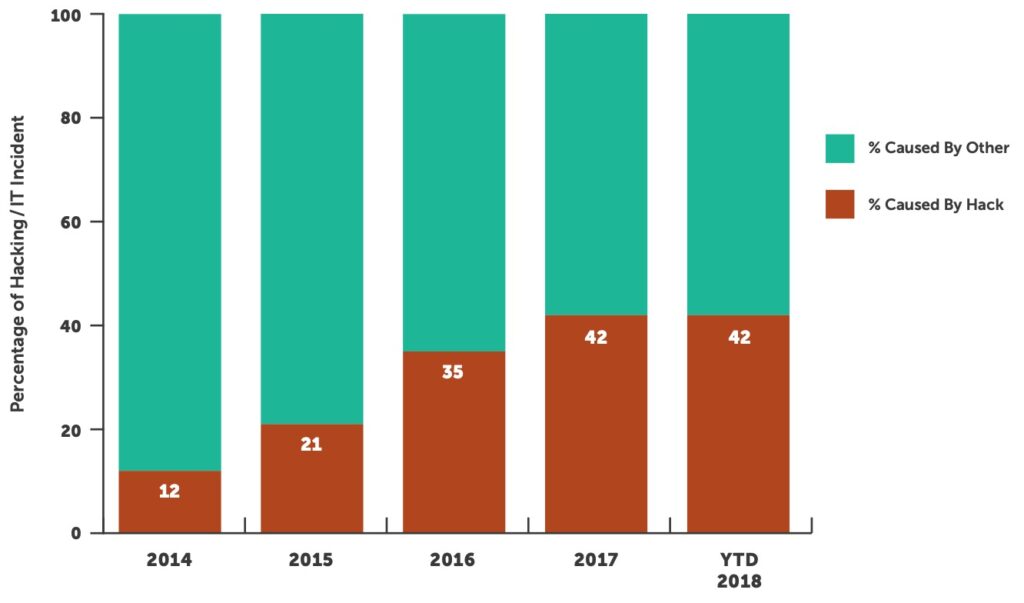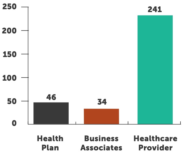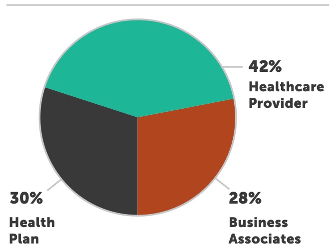 Healthcare provider organizations were the most targeted and successfully breached entities for the 10th year in a row. Over 74% of all reported breaches occurred at provider organizations, down from 80% in 2017. Providers have experienced over 241 breaches this year; we expect that number to climb to over 270 by end of year.