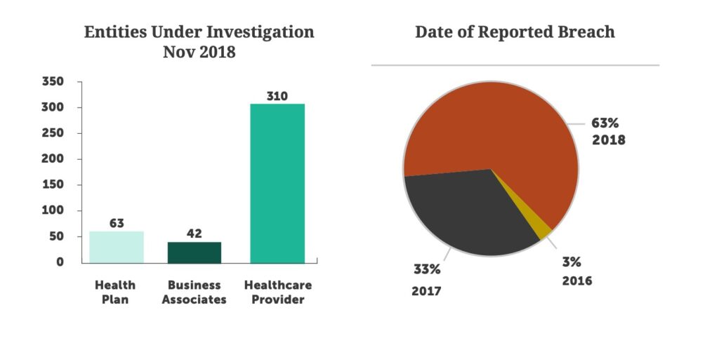 So how did we do? A review of the OCR breach notification data shows the healthcare industry experienced a 13.6% increase in the number of entities reporting breaches over 2017. Between January and October 2017, 360 entities reported a breach versus 312 for the same period in 2018. Healthcare providers represented 74% of reported breaches, an increase of 5%, with 218 provider entities reporting a breach in 2017 and 229 reporting a breach in 2018.1