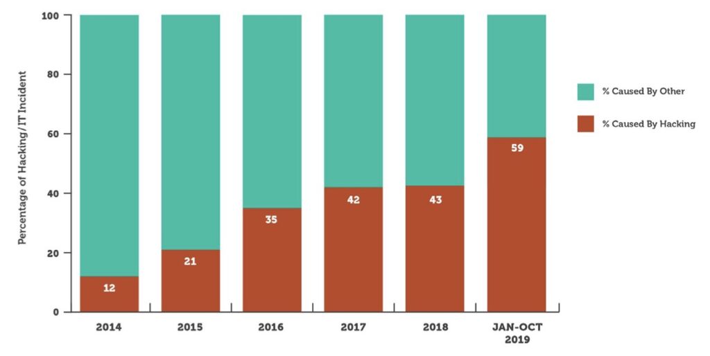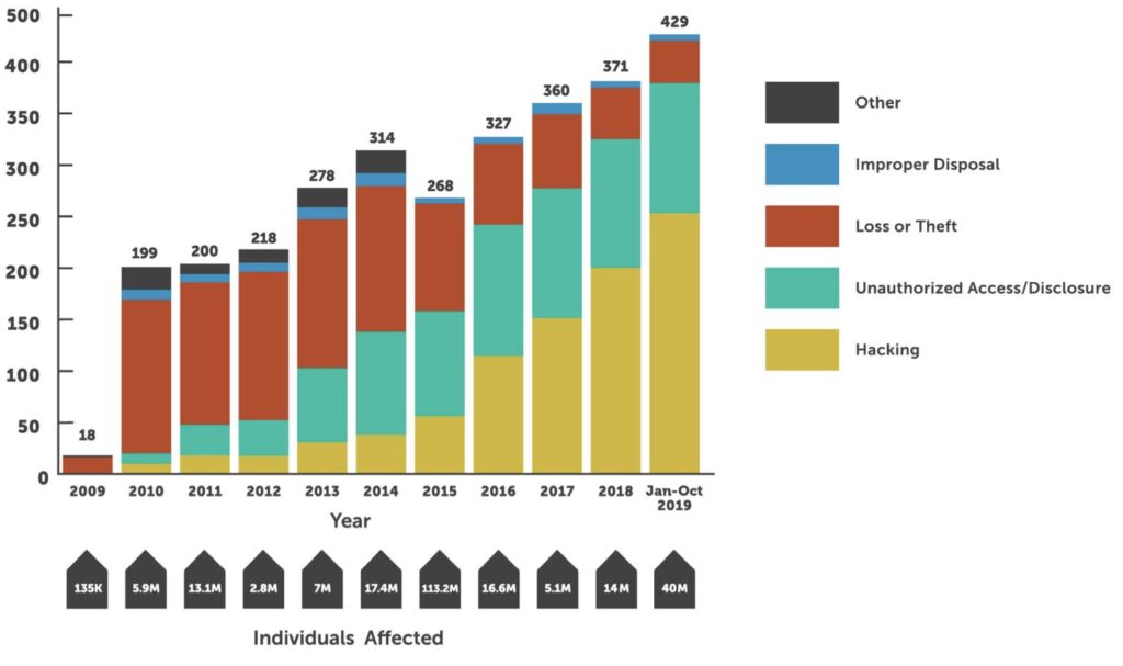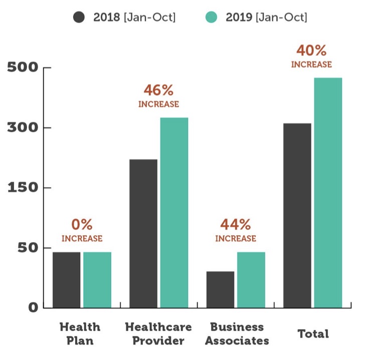 This marks the 10th year that the U.S. Department of Health and Human Services, Office for Civil Rights (OCR) collected and posted breach notification information to the public. 2019 also represents the greatest number of reported breaches in a single year. Through the first 10 months, the number of reported breaches increased 38% compared to the same period last year. In total, over 429 entities have reported a major breach so far, which already eclipses the 371 entities impacted in all of 2018. This equates to over 40 million individuals impacted by these reported breaches. We expect the number of entities reporting a breach to surpass 480 by the end of 2019.