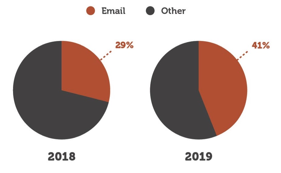So how did we do? According to the reported OCR breach data1, 41% of successful attacks involved email. This is up from 33% in 2018, representing the sixth consecutive year of increases. Individuals who have access to email on your network remain one of your biggest threats. Organizations should continue to invest in security awareness training and conduct regular simulated phishing exercises.