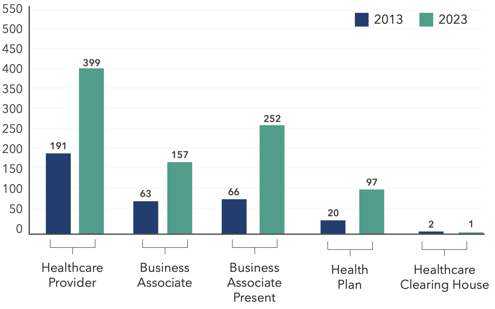 Between 2013 and 2023, the number of Business Associates (BAs) reporting a healthcare data breach increased by 149%. In addition, breaches directly involving BAs and breaches where BAs were present have increased by more than 217% over the past decade.