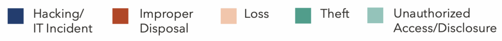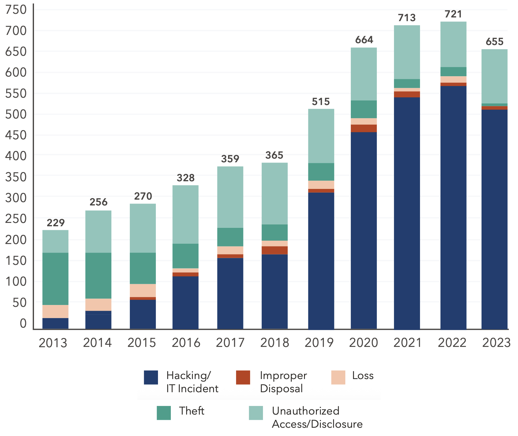 In the last decade, breaches stemming from hacking and IT incidents have increased 1,815%, and breaches from unauthorized access and disclosures have increased 94%. Conversely, breaches resulting from the physical theft of records have declined by 91% since 2013.